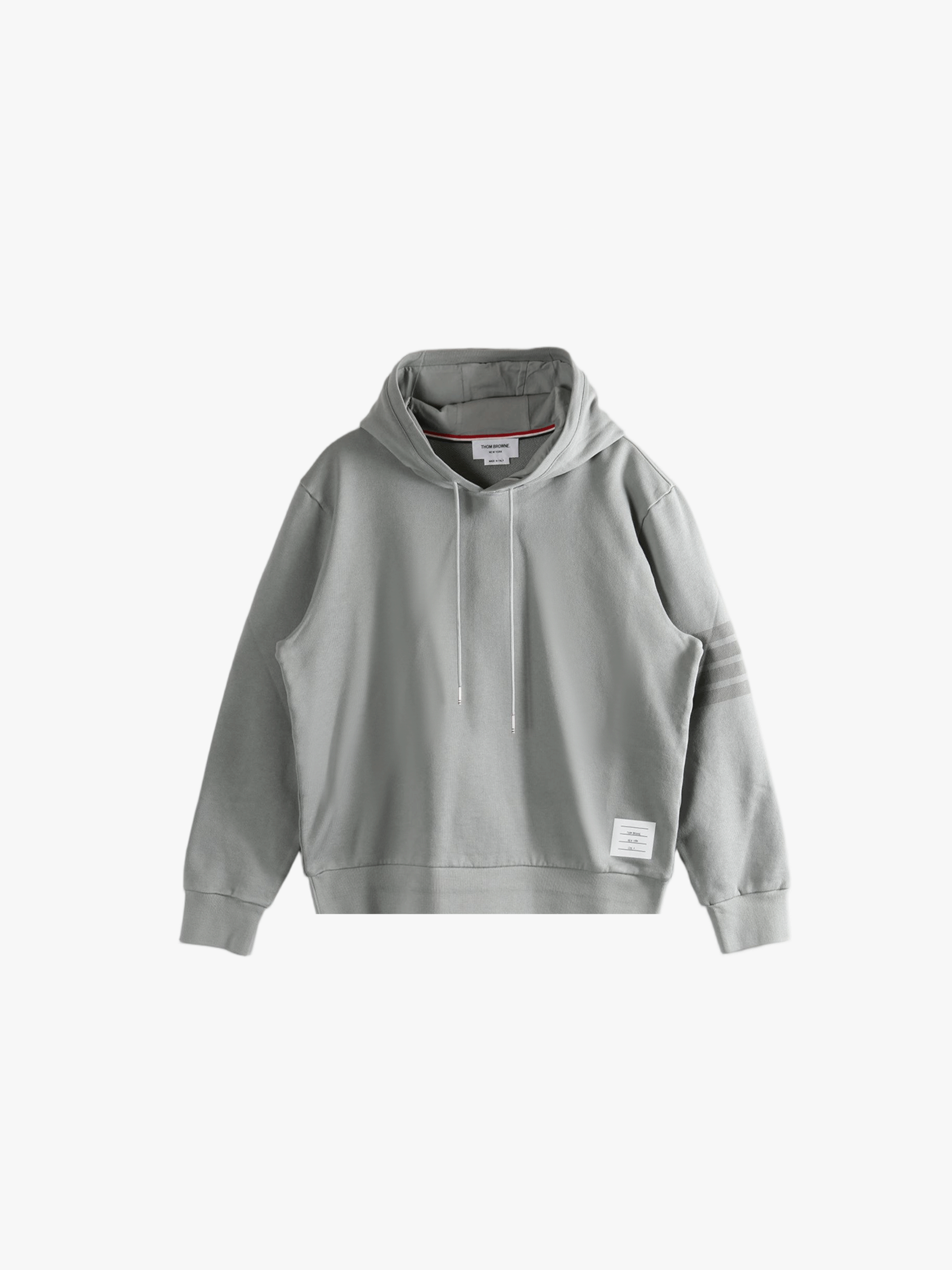 Grey hoodie worn by a person, showing the hoodie fit