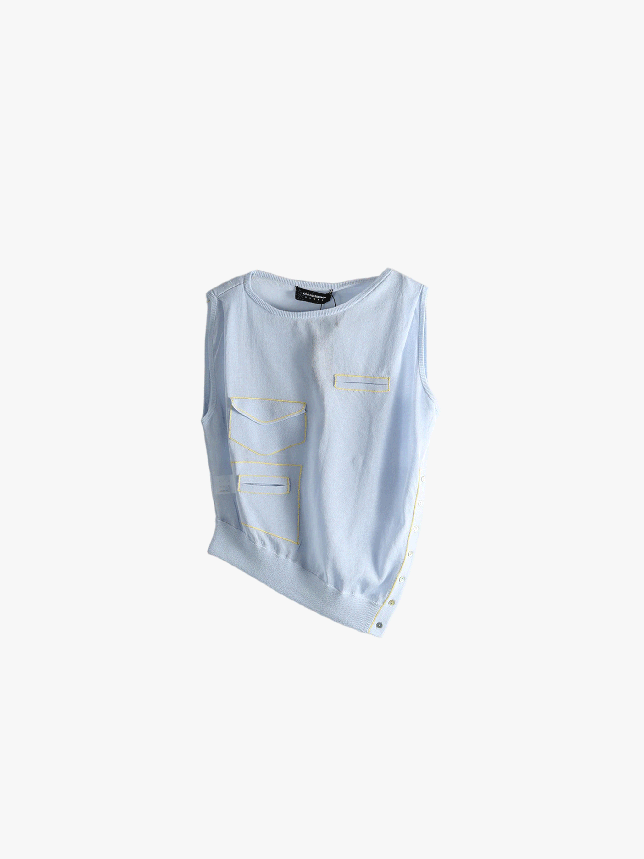 Blue vest worn by a person, showing the loose fit. Blue vest worn by a person, showing the loose fit. Blue vest worn by a person, showing the loose fit. Blue vest, full body view. Blue top , front view