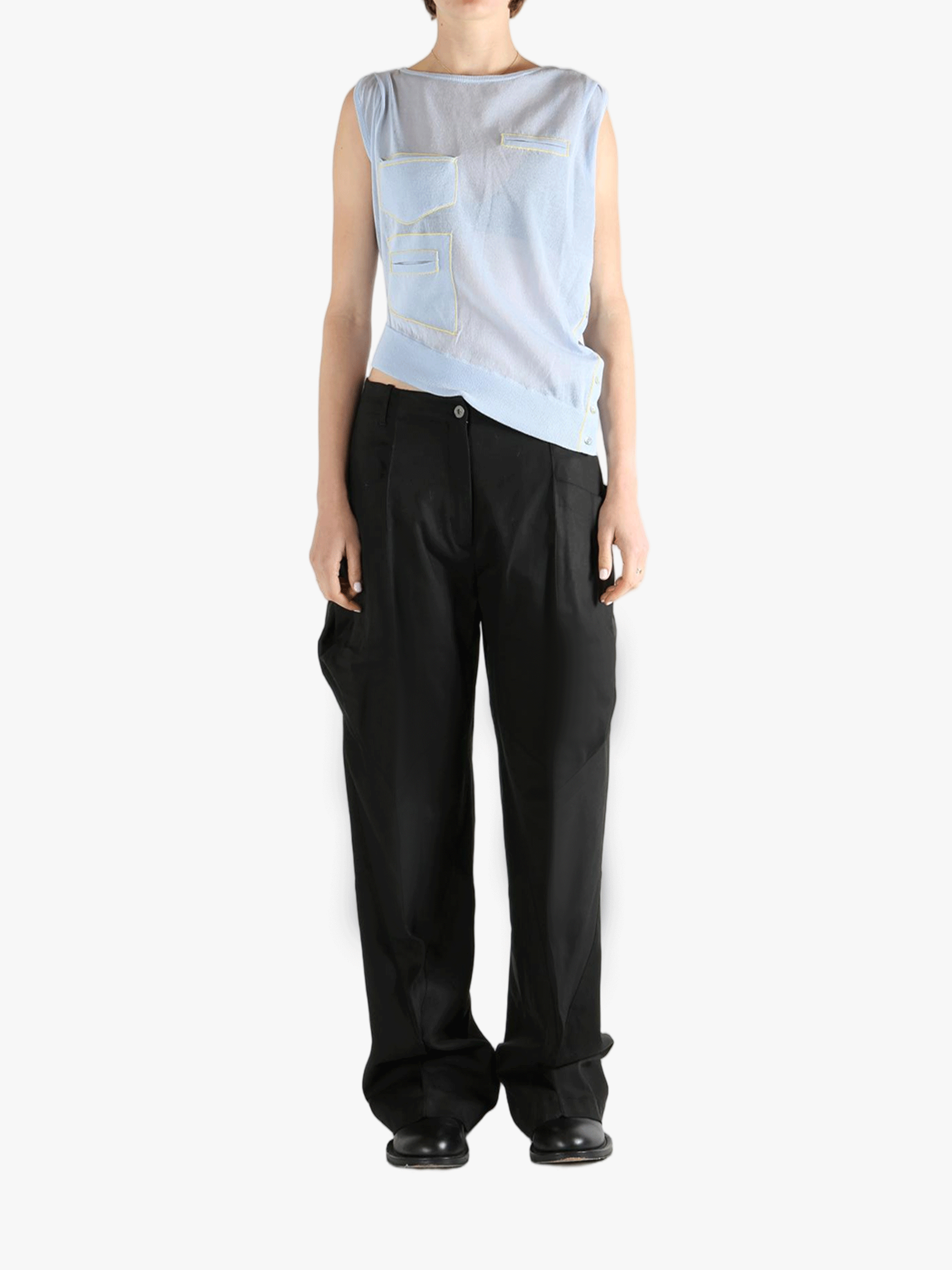 Blue vest, full body view.
