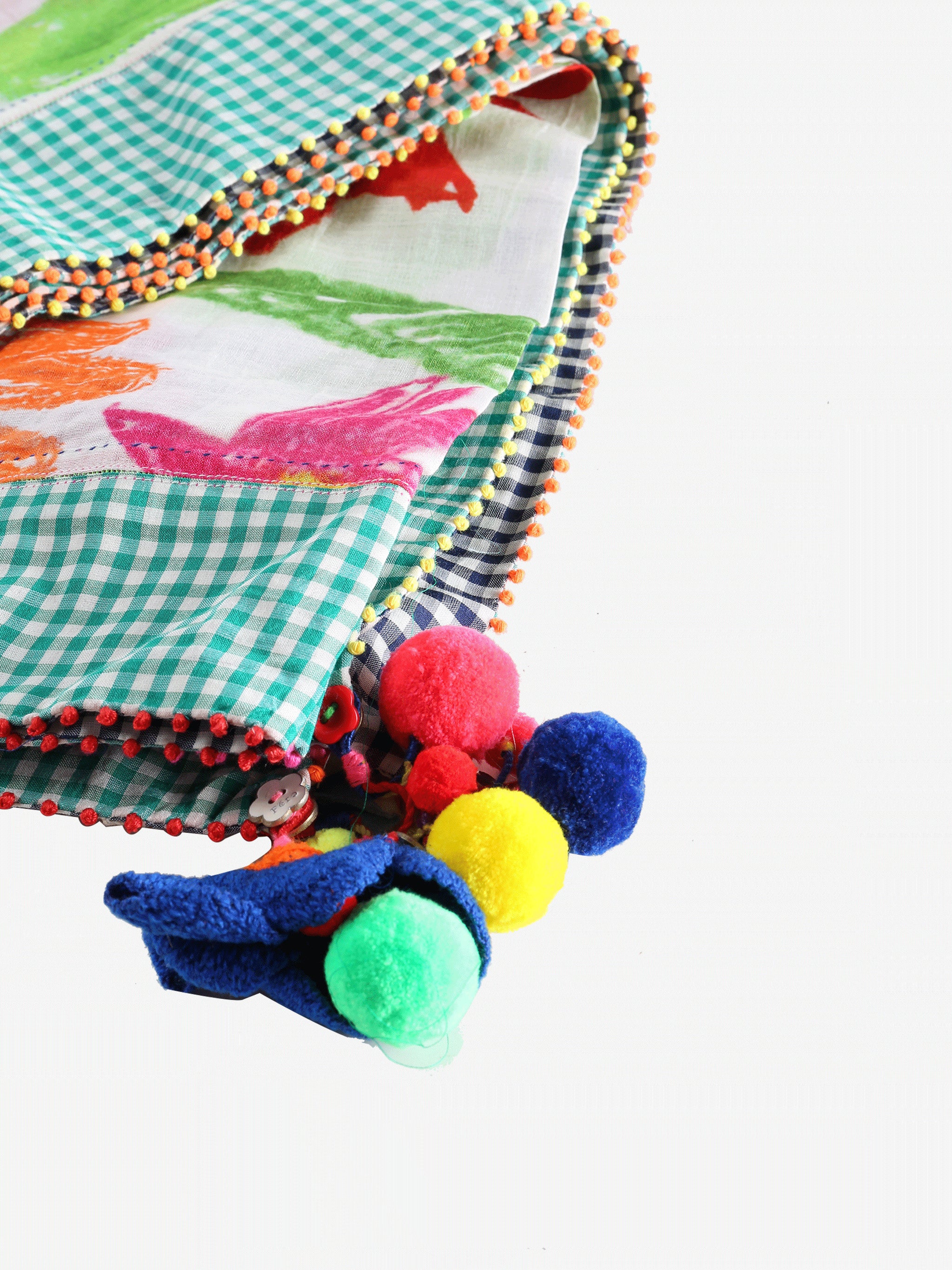 - Hand-stitched accents, crochet trim, and colorful pom-poms